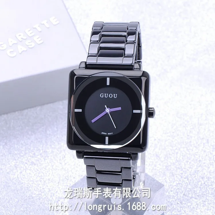 GUOU Wristwatches Quartz-Watches Waterproof Women's Watches Square Dial Black Ceramic Bracelet Upsc